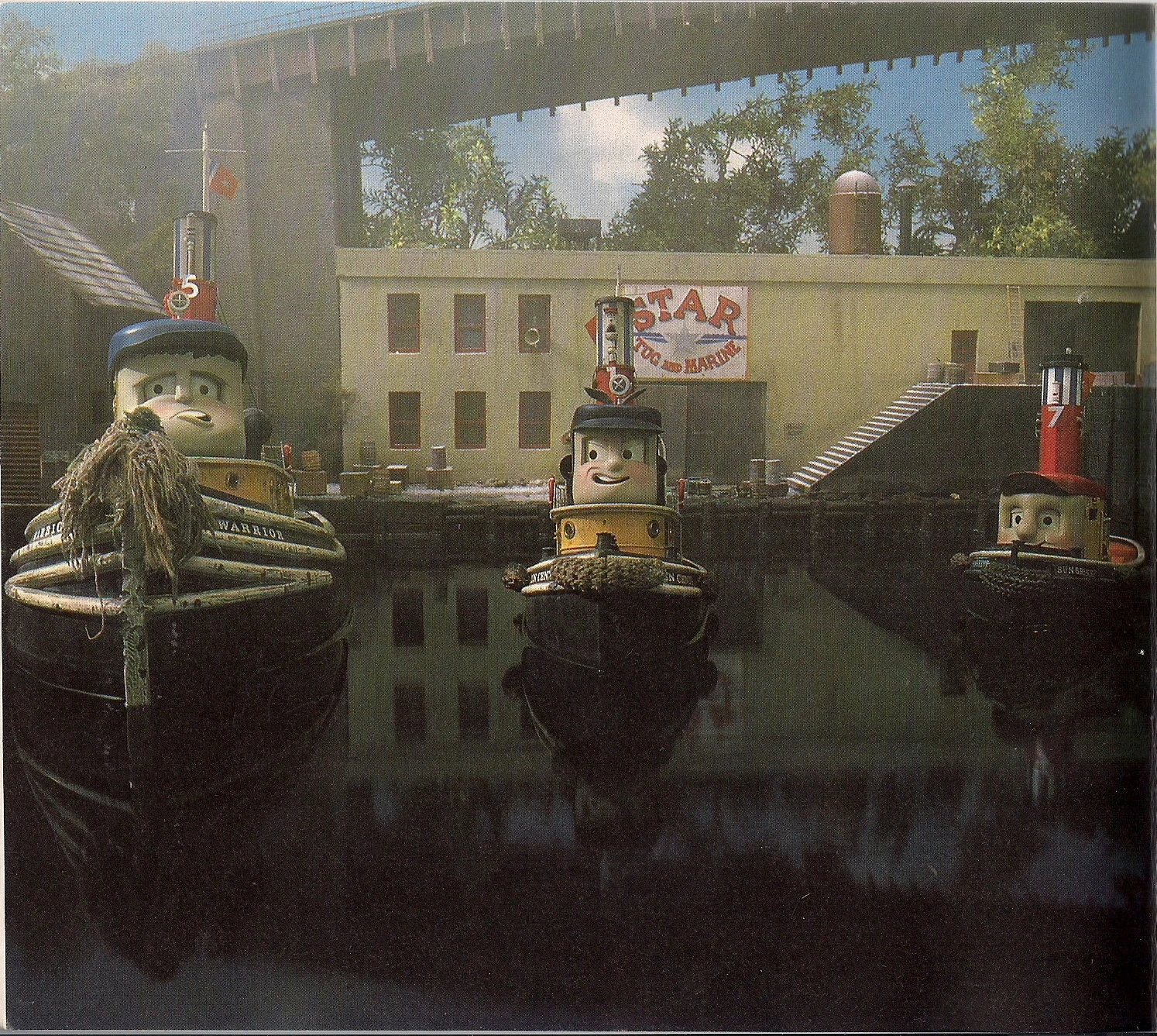 A wood and brick jetty spans across the side, separating this area from the Zero Dock. The tugboats moor here on certain nights to sleep and memorise the days' events. Hercules however has never been seen docked here overnight, the reason supposedly because he is often out on long journeys, escorting ships and other vessels across the ocean, as of his role. Grampus, the midget submarine, is thought to have stayed here after he became a member of the Star Fleet, but most probably kept his original position outside the famous Bridge Café, as seen in the episode Pirate. The dock building itself has six windows, one of which the leader of the Star Fleet, Captain Star communicates out of with the use of a white and blue striped megaphone. Warehouse doors and scattered goods suggests that there is also storage space within, as well as a smaller building located to the left of the quay. Upon the main dock, above large warehouse doors, is a sign reading "Star, Tug and Marine".